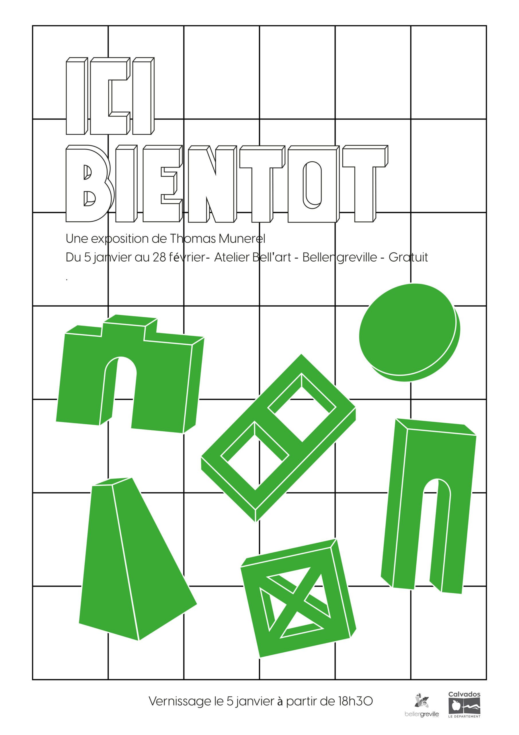 Amorcée par une peinture murale à Bellengreville, la recherche de Thomas Munerel sur les quartiers pavillonnaires se prolonge à l’Atelier Bell’Art. Il pose un regard sensible sur ces endroits peu considérés et s’intéresse aux formes produites par la mise en place du décor suburbain. Se dessine alors un curieux folklore aléatoire, entre résidu vernaculaire, vestige d’une utopie moderniste et fantasme américain façonné par la société de consommation. Il y prélève des formes et des motifs qu’il décontextualise. Ainsi se construit un vocabulaire graphique simple. Ici Bientôt prend la forme d’un imagier abstrait qui esquisse une représentation personnelle de ces lieux.